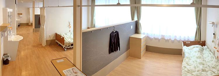 居室は個室(14室)、2人部屋(7室)、4人部屋(3室)でお過ごしできます。多床室でもプライバシーが保たれるように工夫した間仕切り壁の設計で、快適にお過ごしいただけます。